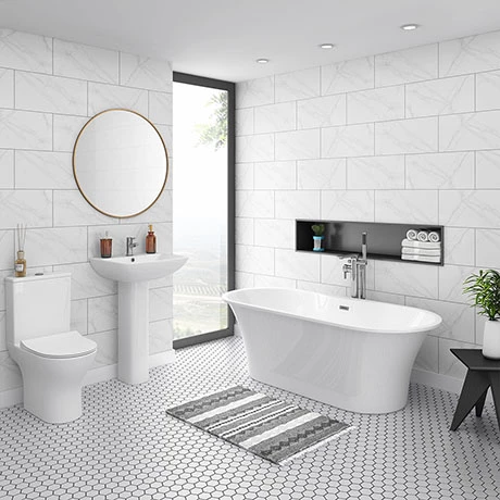 Space at a premium? This gloss white Alps Bathroom Suite is a functional choice for smaller spaces. The elegant curves of this 1660mm long bath are accompanied by a compact basin, short projection toilet and ceramic pedestal sink, making this modern bathroom suite a great space saver with a timeless look. The modern freestanding bath is double ended for extra comfort and has a roll top exterior crafted from heat holding acrylic to keep your water warm for longer. A semi back to wall toilet comes complete with a handy soft close seat that prevents those unpleasant slamming noises.
