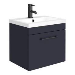 Arezzo Blue Wall Hung Sink Vanity Unit + Toilet Package with Matt Black Handle