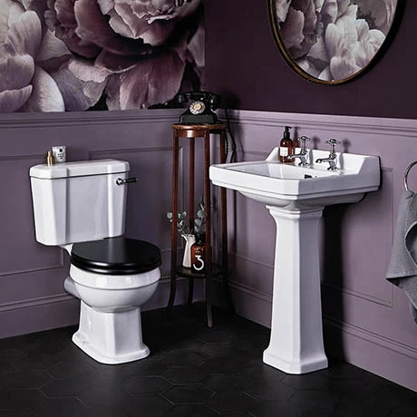 This Fitzroy close coupled bathroom suite is the ideal upgrade for any traditional bathroom. It’s Victorian and Edwardian inspired design will add a touch of elegance and style. The suite comprises of a close coupled toilet with a ceramic lever flush and a full pedestal 2 tap hole washbasin available in three sizes. Bayswater offer a 5 year guarantee against all of their ceramics.