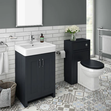 The Chatsworth traditional 560mm wide Graphite vanity unit with wc unit package, Victorian inspired design with a modern twist. The Chatsworth range of charming bathroom furniture features classic styling with a satin Graphite finish cabinet and tongue-and-groove side panelling.
