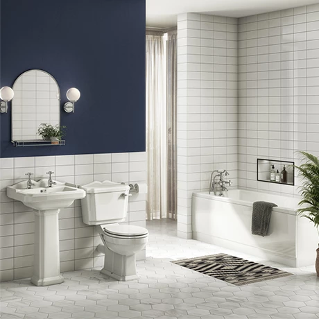 The Traditional Ceramic Bathroom Suite with Standard Single Ended Acrylic Bath with panel. Evoking the classical style of a bygone era, yet manufactured to today’s high exacting standards, the legend bathroom suite is perfect for providing a period look in any home. Comes with stunning traditional bath and basin taps.