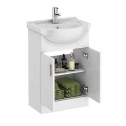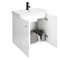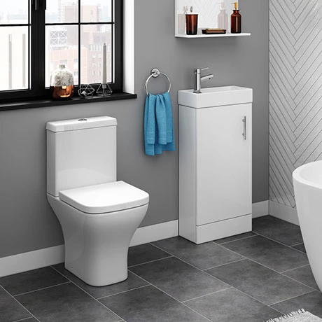 With clean lines and compact dimensions, this Venice Small Cloakroom Suite is a great fit for smaller bathrooms. The set features a close coupled toilet that projects just 600mm, a vanity unit and a glossy ceramic wash basin that sits neatly on top. Each piece in this cloakroom bathroom suite has a minimalist feel and comes in classic white that will work well with fixtures in a variety of finishes. Slot towels and toiletries into the vanity unit, which features a handy inside shelf to keep bathroom clutter neatly concealed.